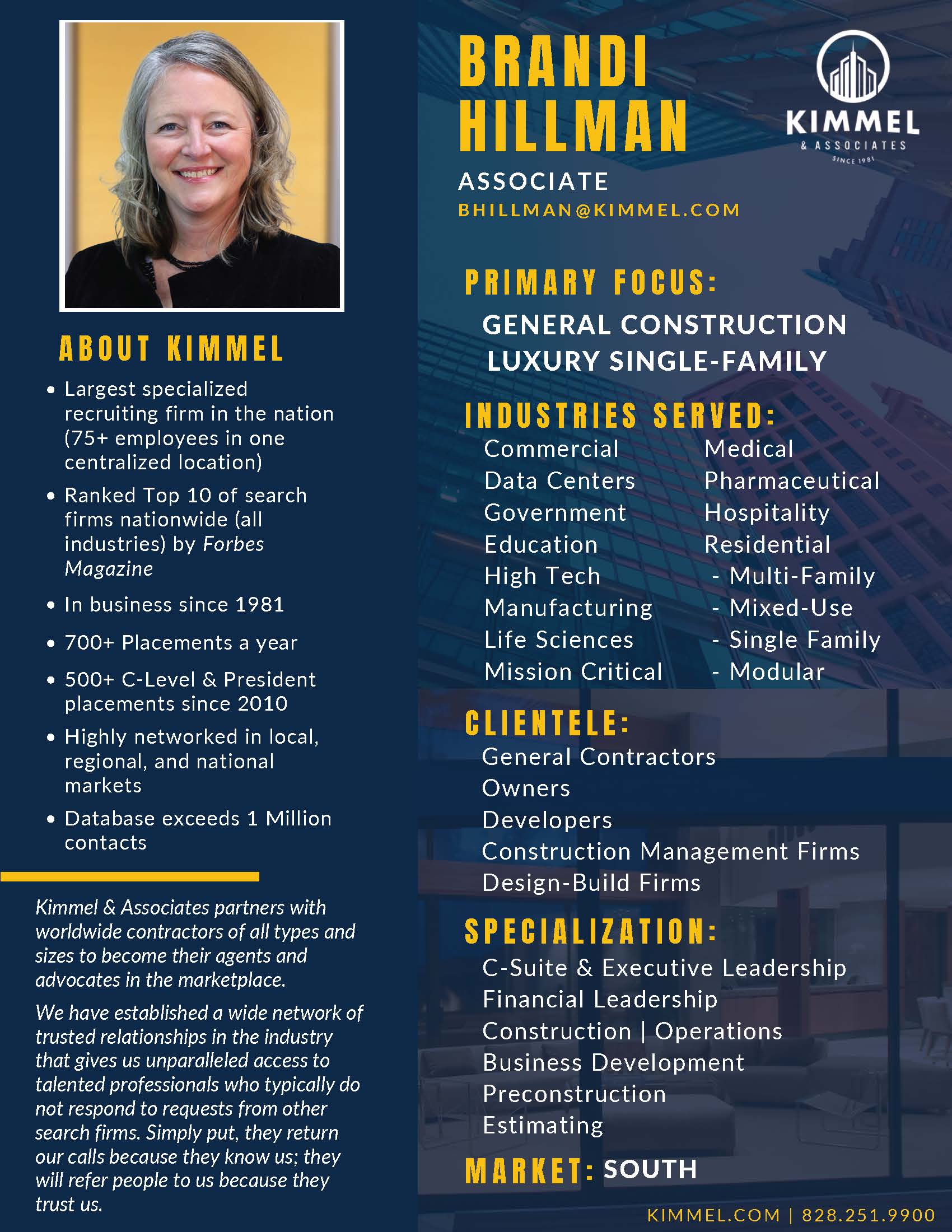 AssociateBrandi joined Kimmel & Associates in 2026 as an Associate in the General Construction Division. Her professional background includes 19 years of experience in sales, finance, business development, and business/franchise ownership.
